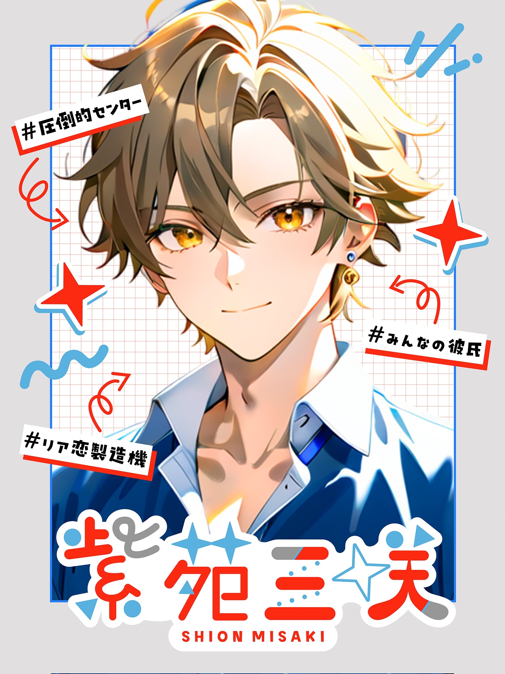 アイドルグループ『IDOL KISS』の絶対的センターを務める、正統派の俺様イケメンアイドル。舞台上では無邪気で快活、犬のように懐っこい性格で観客を惹きつける存在♡ 八重歯がのぞく笑顔と、細身ながら鍛えられた身体がファンを魅了する。